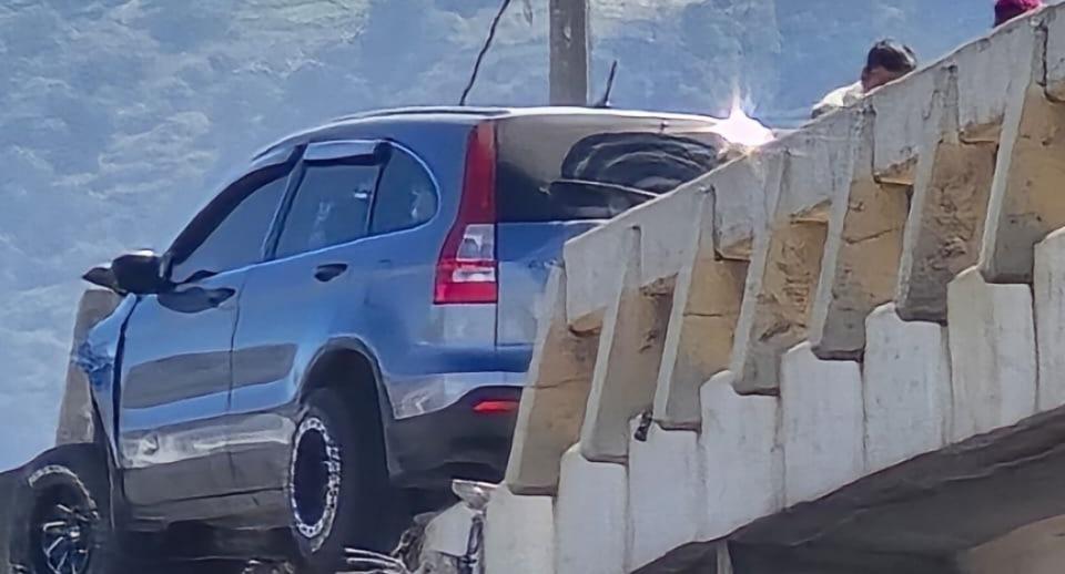 Bomberos Municipales reportaron que el automóvil dañó parte de la estructura del puente y quedó con peligro de caer desde el lugar.